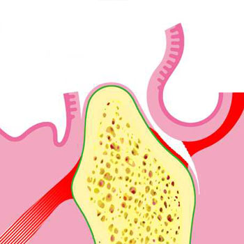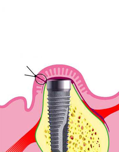 Nach einer örtlichen Betäubung wird die den Kieferkamm bedeckende Schleimhaut geöffnet (Bild 1). Mit einem Spezialbohrer wird im Knochen ein genau auf das Implantat abgestimmtes Loch geschaffen (Bild 2). Nach dem Implantieren (Einsetzen des Implantates) wird die Schleimhaut wieder geschlossen. Nun muß das Implantat einheilen (Bild 3). Der Knochen stabilisiert das Implantat und nach 8 bis 10 Wochen sind beide fest miteinander verwachsen. Nach abgeschlossener Einheilphase schraubt der Zahnarzt das Aufbauelement (Abutment) ein und setzt die fertige Krone auf das Implantat (Bild 4).